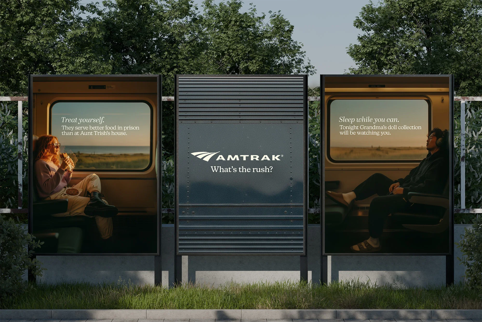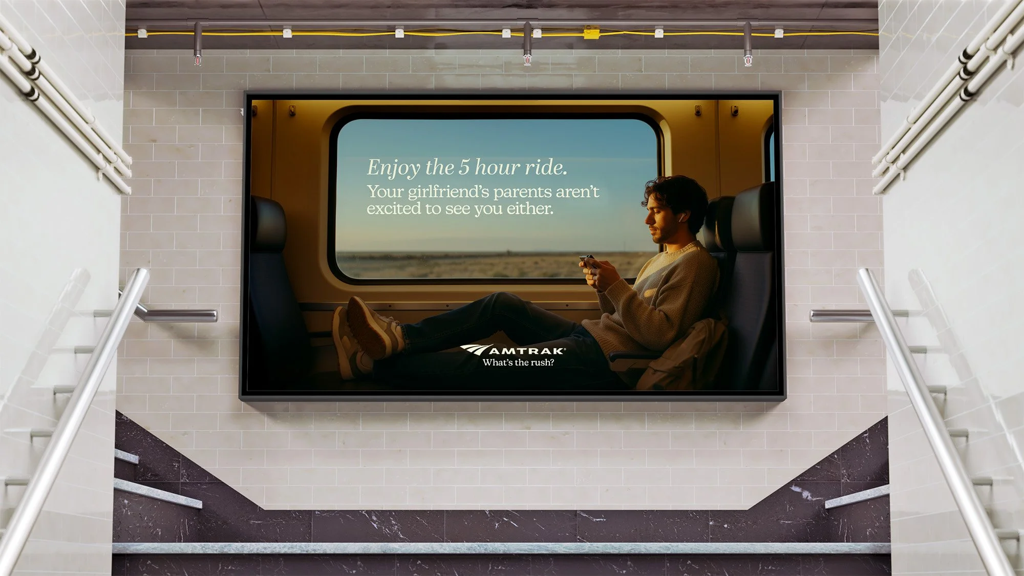 Amtrak will place these signs in high traffic locations and transit hubs to highlight how taking the train extends your time away from things you dread about the holidays.